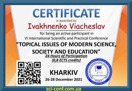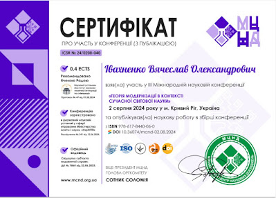 02 серпня 2024 року участь у ІІІ Міжнародній науковій конференції "ТЕОРІЯ МОДЕРНІЗАЦІЇ В КОНТЕКСТІ СУЧАСНОЇ СВІТОВОЇ НАУКИ", м. Кривий Ріг, Україна